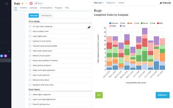 La extensión muestra informes preconstruidos relevantes para el proyecto que se está viendo actualmente en Asana, como un proyecto titulado "Bugs". Los usuarios pueden editar fácilmente estos informes, exportarlos en formatos como CSV, Excel o imagen, y acceder a cualquier informe personalizado que hayan creado dentro de Velocity. Esto lo convierte en una herramienta valiosa para los equipos que buscan obtener una comprensión más profunda de sus datos de proyecto y mejorar la gestión de su flujo de trabajo.